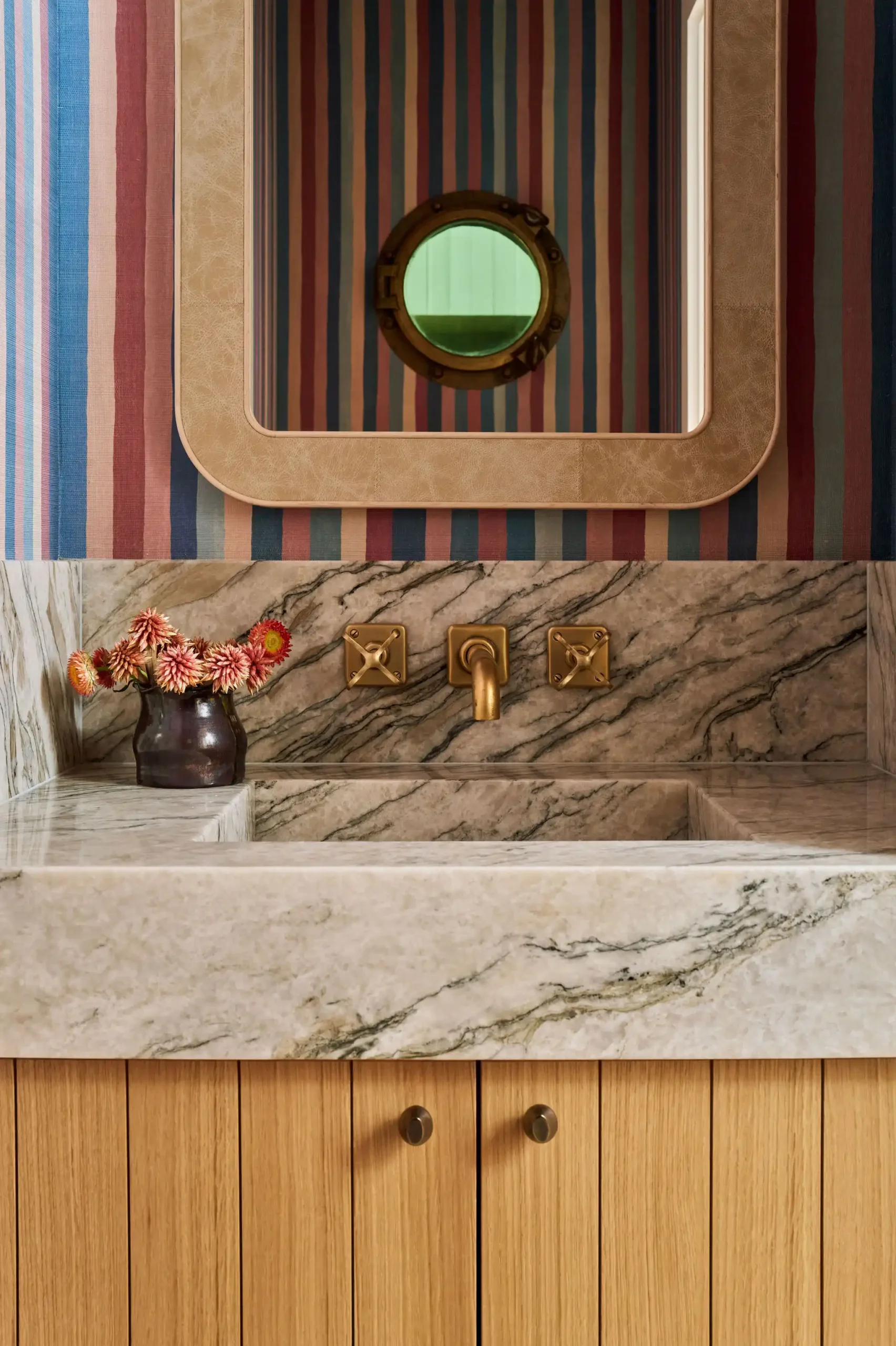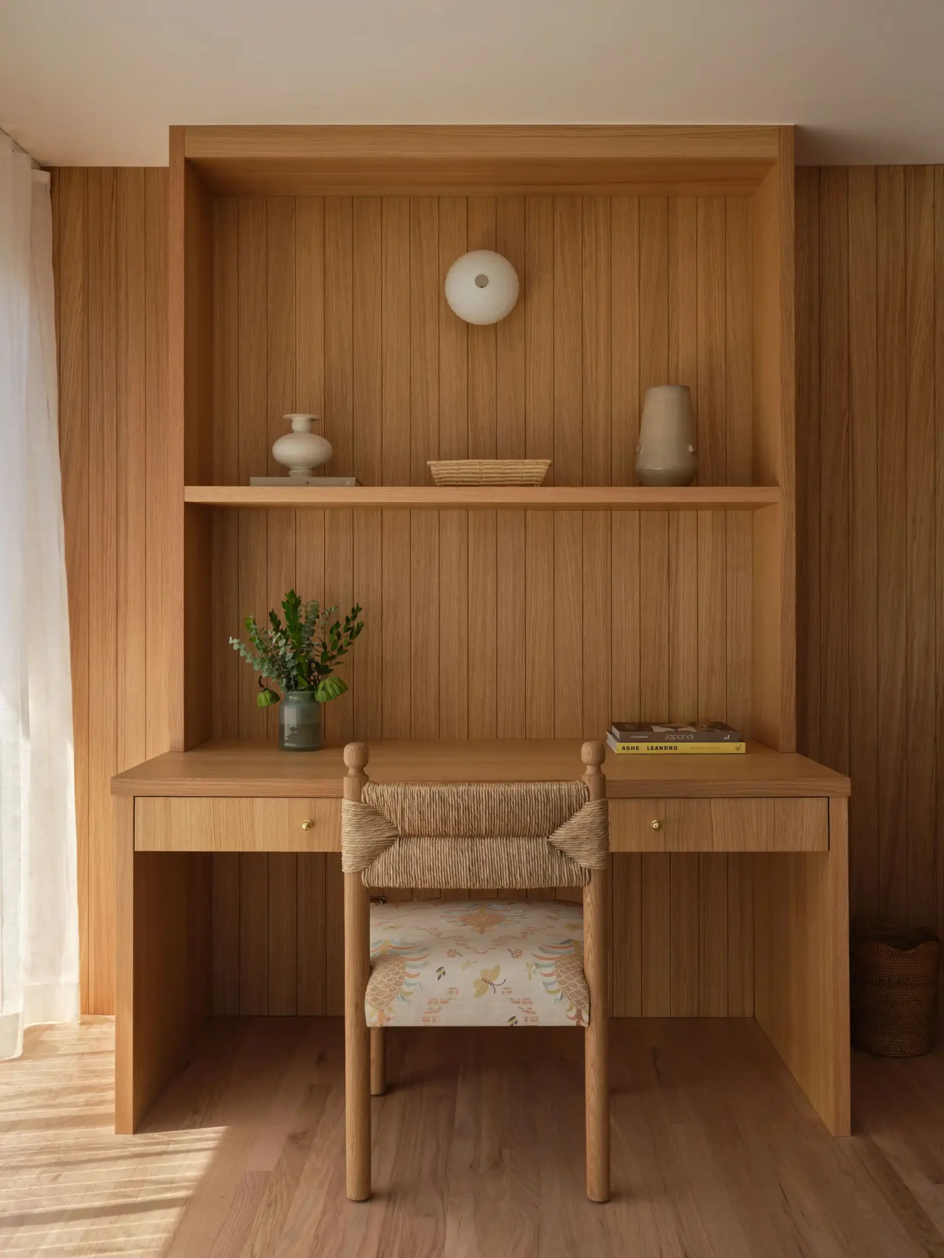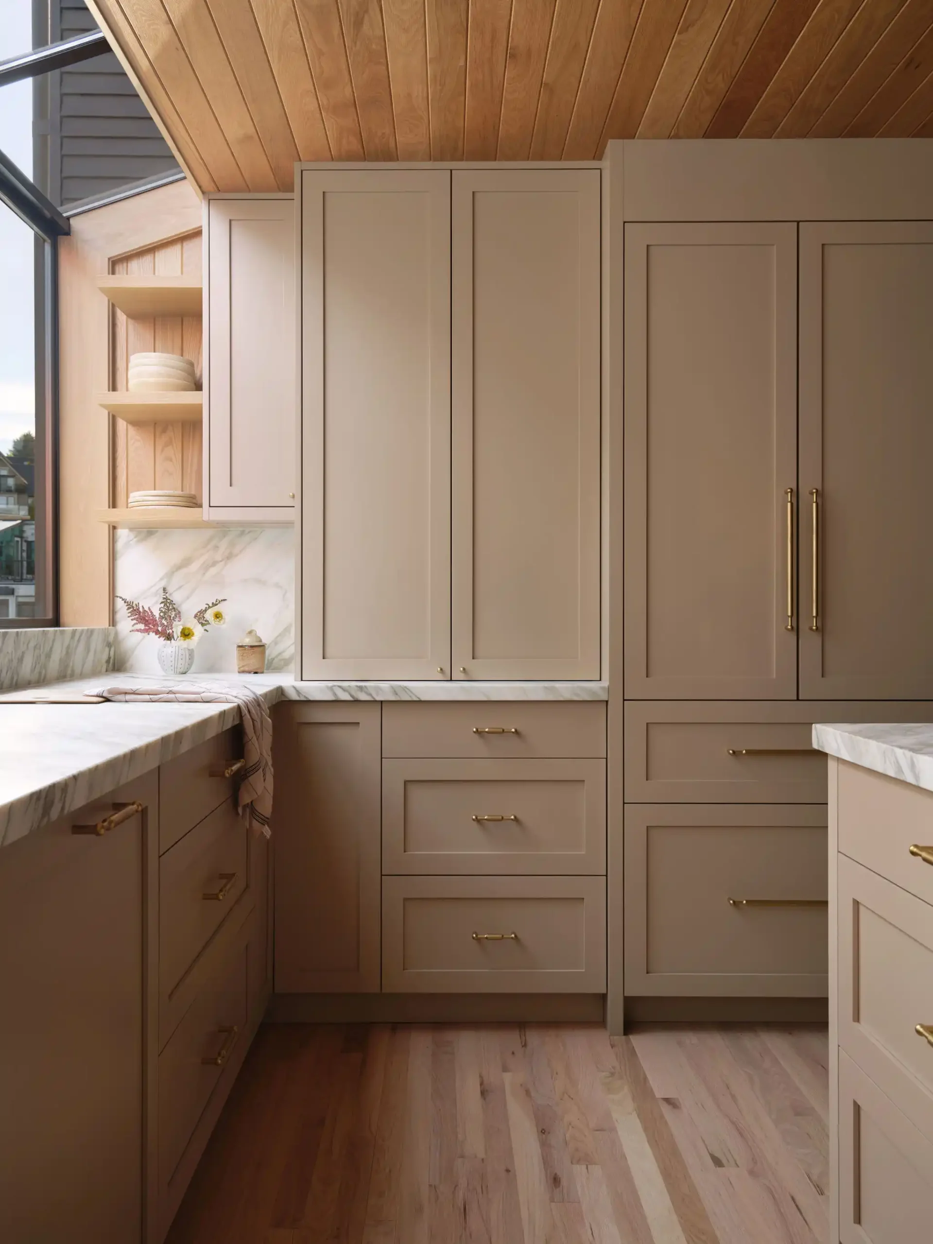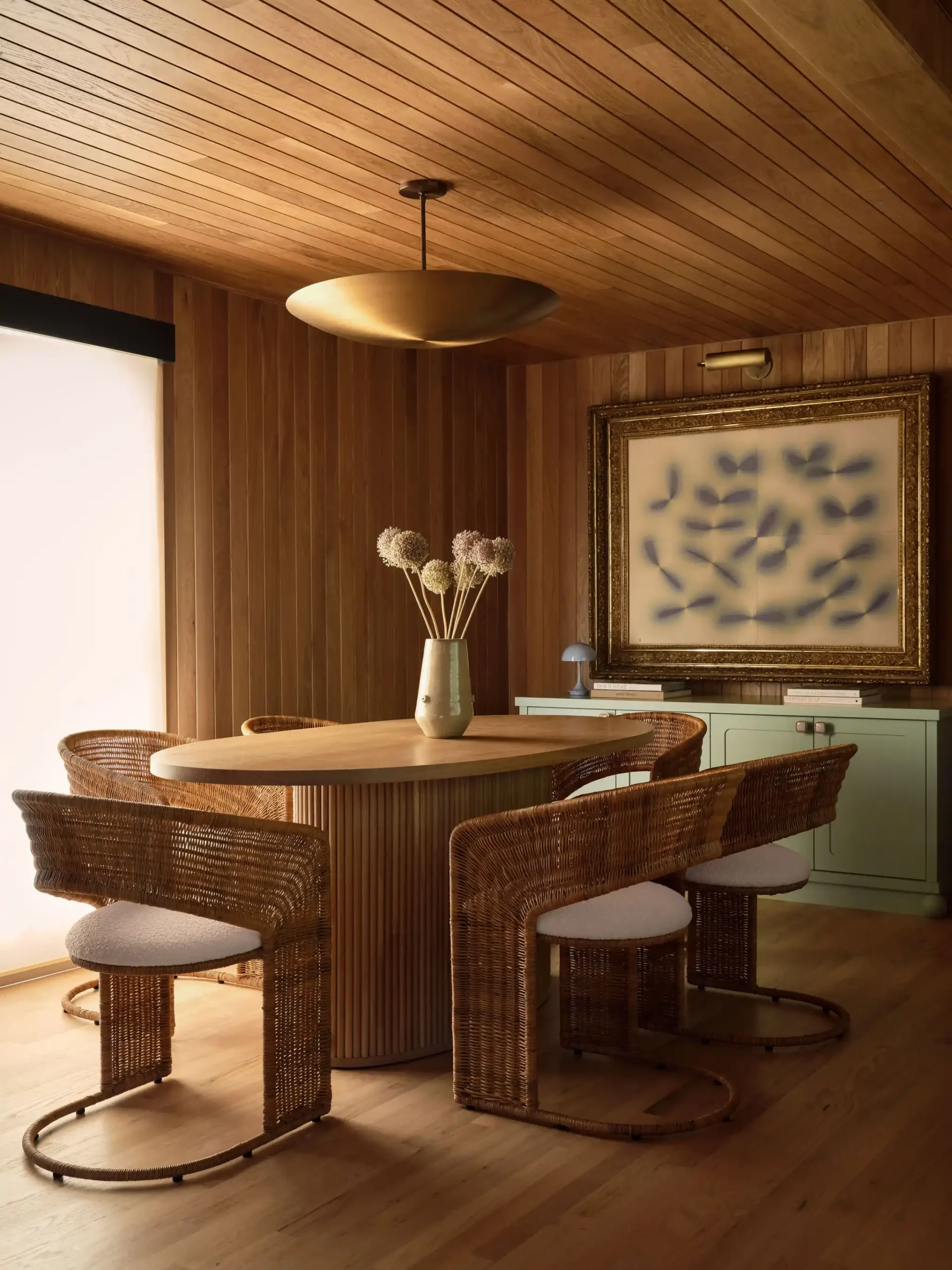 The space captures the spirit of its setting with warm white oak cladding wrapping the ceilings and walls. Playful color moments, painted cabinetry, and bold marble mingle with curated pieces from Nickey Kehoe, Lindsey Adelman, Urban Electric, Apparatus, and Stahl + Band. Artworks by Udo Nöger, Karen Gunderson, and Curtis Steiner add soul and sophistication. The result is a scandi-eclectic, lived-in haven—crafted for a company President & CEO who sought to embrace Seattle’s coastal energy after trading the desert Southwest for the Pacific Northwest.